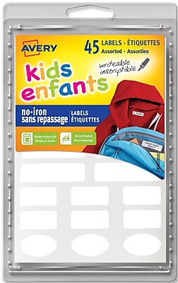 Avery® No-Iron Clothing Labels - Assorted Shapes & Sizes Keep your children's clothing out of the lost-and-found with these no-iron labels. Each sheet includes 15 labels. Perfect for labeling jackets, T-shirts, hats, backpacks and more Simply write, peel and stick - no iron required Labels withstand multiple washing machine and dryer cycles Handwrite only using permanent markers for best results